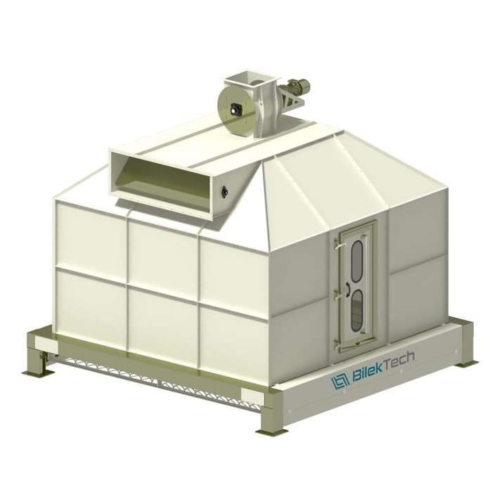 Soğutucu, pelet presinden çıkan sıcak peletin ortam sıcaklığına getirilmesini sağlamak için kullanılır.